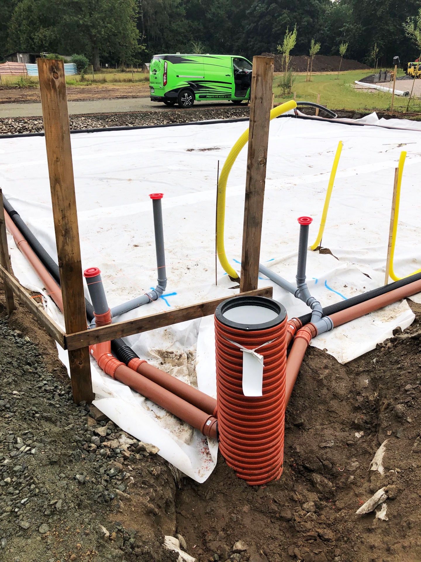 Förutom att etablera arbetsplatsen så har vi börjat schakta, gjort en grovutsättning, satt dagvattenbrunn samt börjat gräva för el och vatten. Här går det undan!