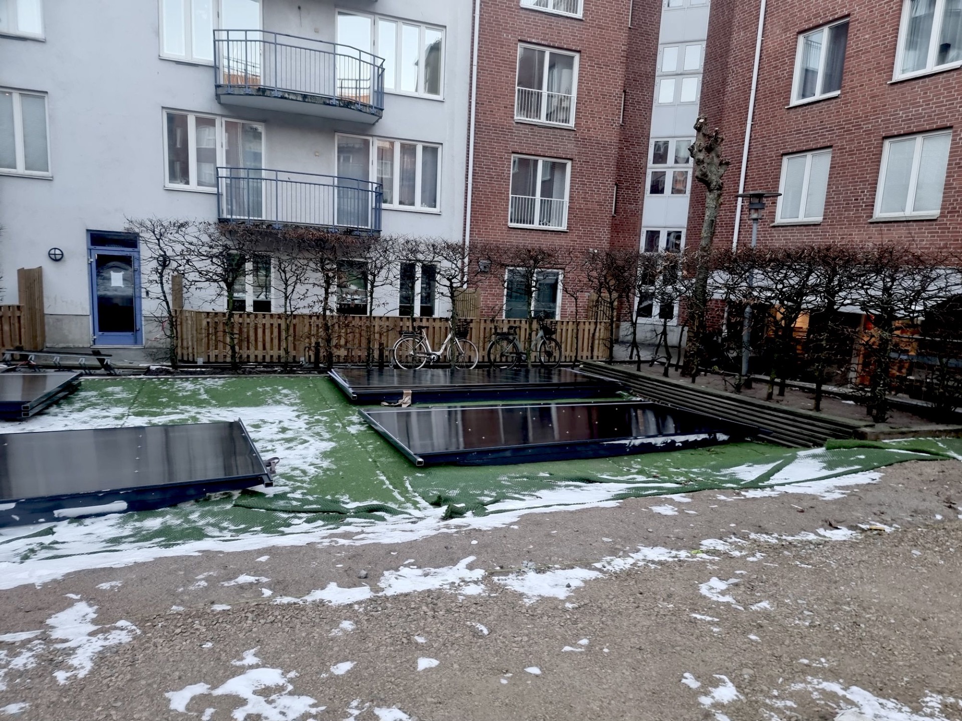 Det är många delar som ska in genom den trånga gången men är man flera stycken som hjälps åt går det bättre. Plintarna till huset satte vi innan jul och nu är det dags att börja bygga ihop alla delar. Eftersom det är minusgrader och vinter kan vi inte asfaltera även om miljöhuset står klart. Det innebär att innergården inte kan brukas förens till våren när asfaltsläggarna drar igång för säsongen.