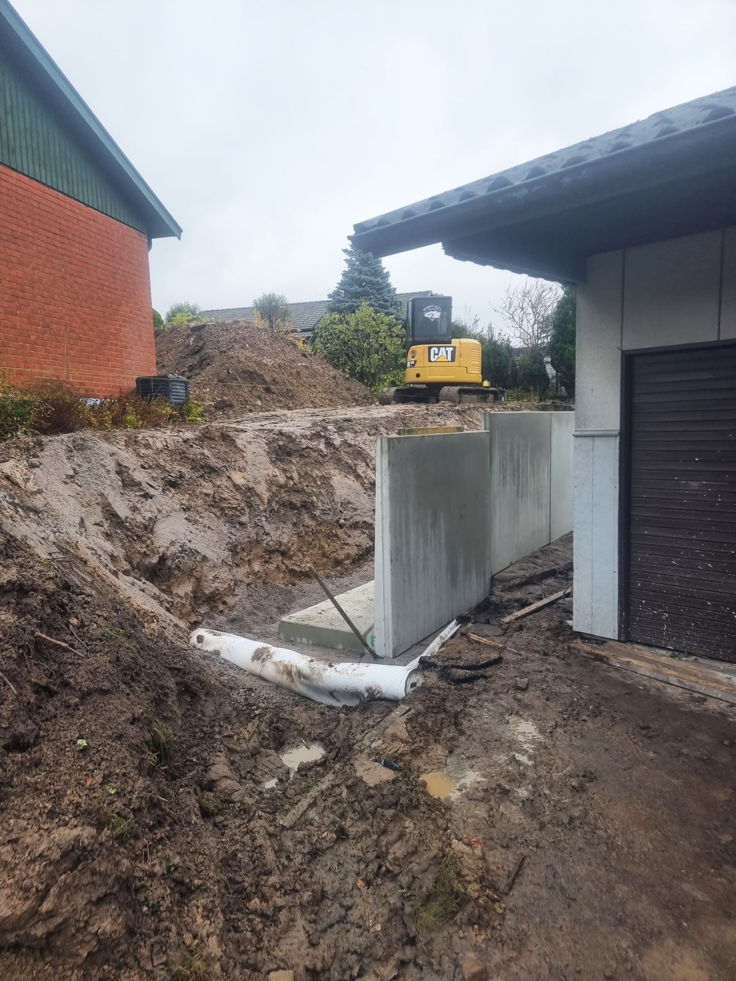 Ett riktigt och viktigt lyft för båda grannarna. Dagvattnet hanteras korrekt och nivåskillnaderna hålls isär med stabila stöd. Kvar på platsen lämnar vi lite material som ska användas för att fylla upp eventuella sättningar som det blir efter att marken reglerat sig. Det är mer regel än undantag att marken sätter till sig och behöver justeras i efterhand. Speciellt i dessa väderförhållanden.